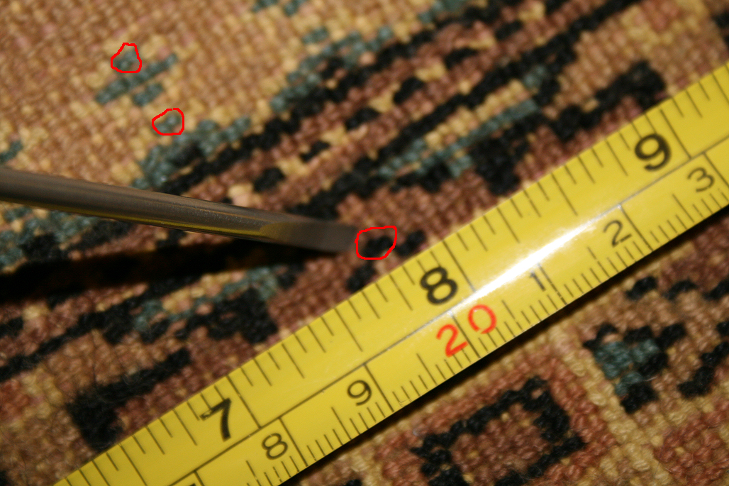 Note that the knotting in some rugs makes them look like they have twice as many knots horizontally than they actually have. The red circles show 2 nodes, this is actually only one knot. You will notice there is no colour on this rug which appears to have only a single node in the way the one above it has.