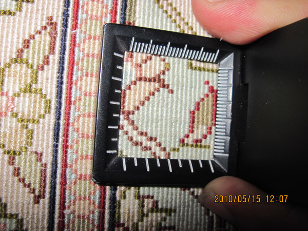 In Tabriz the term Raj is often used rather than KPSI - this is the number of knots across 2 3/4 inches of a rug. Typical measurements are "30 raj", "35 raj", "40 raj" or the super fine "60 raj". A standard quality Tabriz at 35 raj would translate to around 162 KPSI (35/2.75=12.73... 12.73x12.73=162