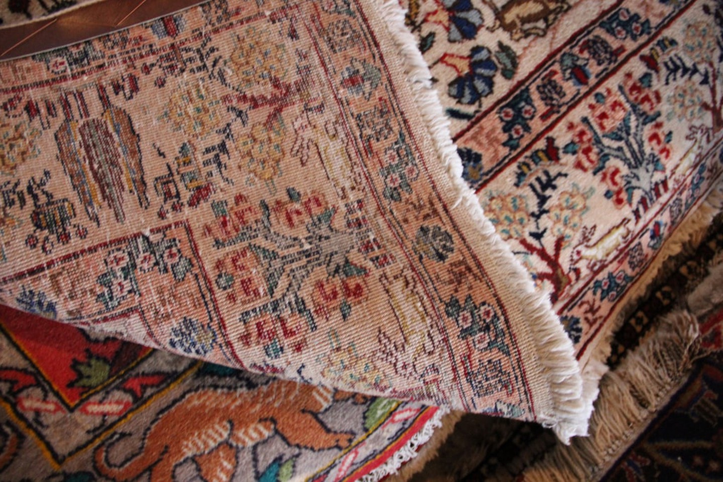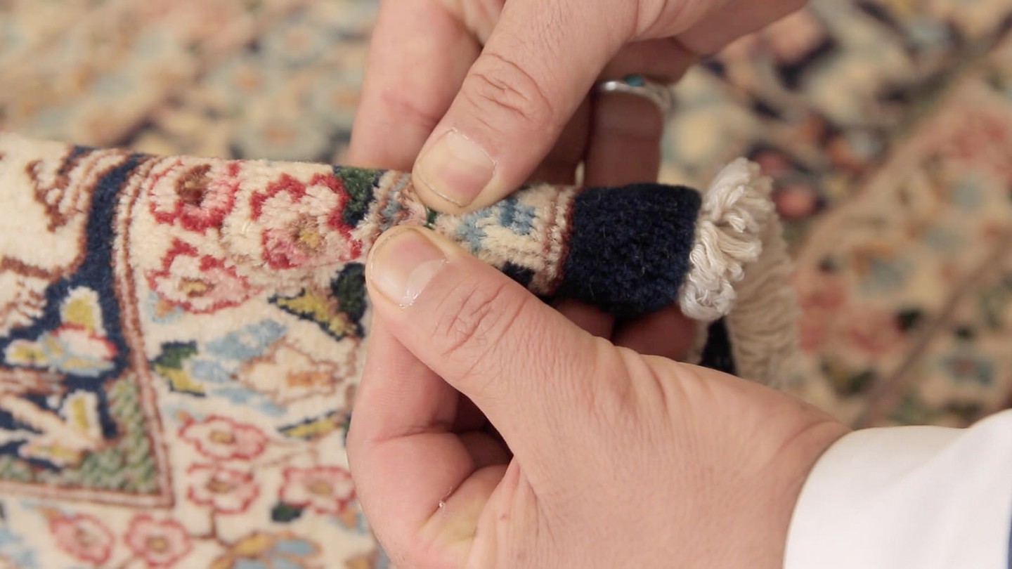 Traditional Persian carpets are made from natural dyes, so you want to look for colors that seem to come from nature: cochineal insects for reds, the indigo plant for blues, and pomegranate rind for shades of yellow. Synthetic dyes tend to penetrate the fiber evenly, whereas natural dyes will coat the surface. Bend the carpet to isolate a few threads, and if you notice a subtle unevenness, then you know you’re dealing with natural colors.